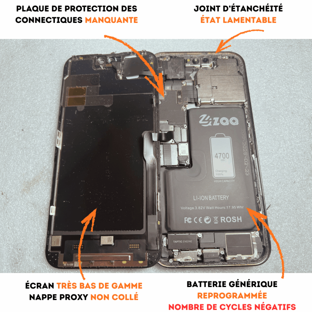 Résultat : les téléphones sont livrés brillants, emballés, certifiés “grade A+”… mais avec des composants internes approximatifs.